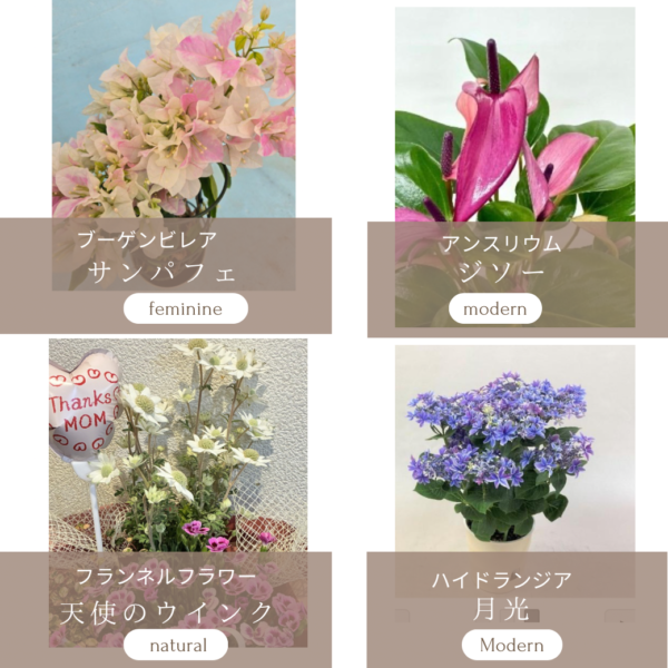 29日にはフェミニンな「ブーゲンビレアサンパフェ」をセットした寄せ鉢バスケットやモダンシックのアンスリウム「リリー」「ジソー」 。ナチュラルテイストのフランネルフラワー「天使のウインク」入り寄せ鉢バスケット。