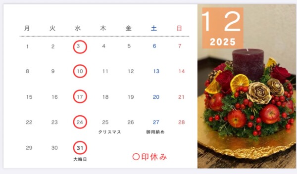 2025年も残すところ8日となりました。花の生華園は、年内30日(火)午後6時まで通常営業(11時30分〜12時30分まで昼休暇)して参ります。31日は、午前中のみ、ご予約のお客様の引渡しのみ対応とさせていただきます。