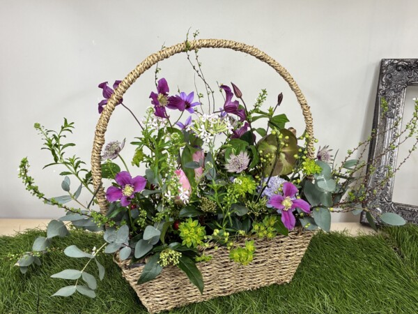 花や葉が幾重にも重なり、立体感のあるバスケットアレンジメントに仕上がりました♪^^