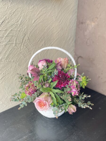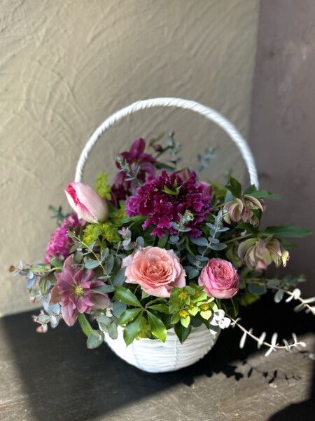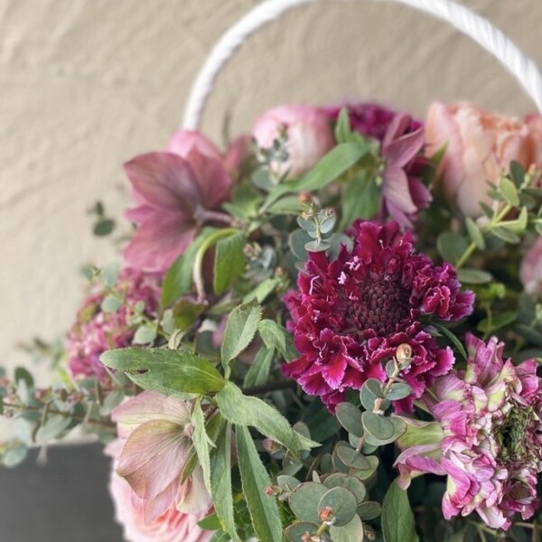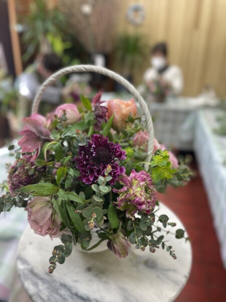 クリスマスローズ(ダブルエレガンスパープル)・チューリップ(ピンクマジック)(スウィートパラダイス)・スカビオサ(グランワイン)・ポンポンラナンキュラス(マルバ)・スプレー薔薇(ミスティックサラ)・ブプレウルム・グニューユーカリ・馬酔木